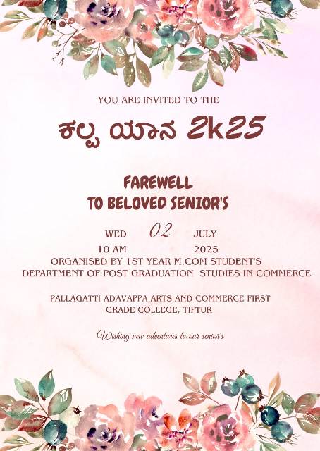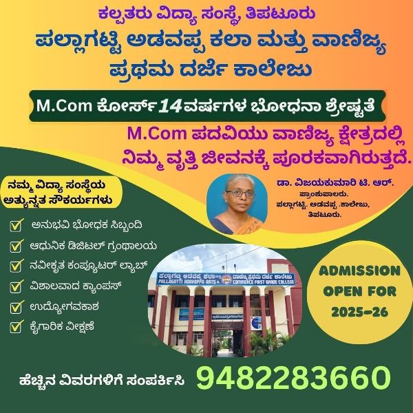 It is with immense pride and a deep sense of commitment that I welcome you to Pallagatti Adavappa Arts and Commerce First Grade College, Tiptur an Institution under Kalpataru Vidya Samsthe ® is dedicated to fostering academic excellence, ethical values, and holistic development since its inception in 1962. For over six decades, our college has been a beacon of knowledge, shaping generations of students from rural area into responsible and accomplished individuals. [In 1982 because of huge strength the Kalpataru College got bifurcated as Pallagatti Adavappa Arts and Commerce First Grade College and Kalpataru Science College].