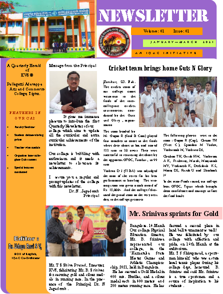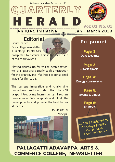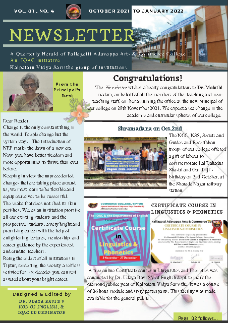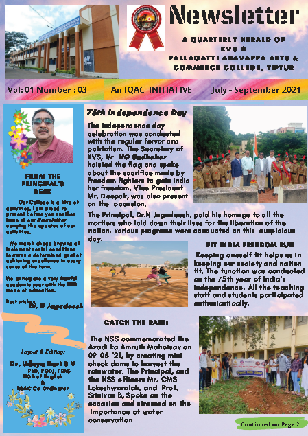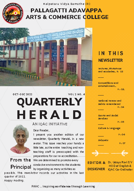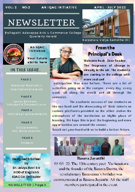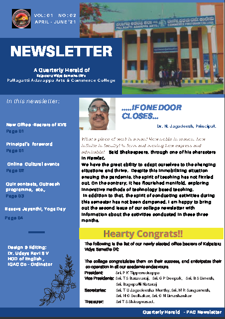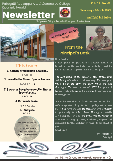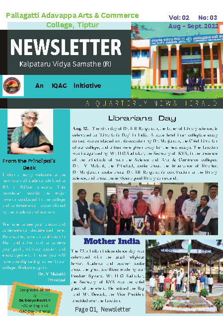 It is with immense pride and a deep sense of commitment that I welcome you to Pallagatti Adavappa Arts and Commerce First Grade College, Tiptur an Institution under Kalpataru Vidya Samsthe ® is dedicated to fostering academic excellence, ethical values, and holistic development since its inception in 1962. For over six decades, our college has been a beacon of knowledge, shaping generations of students from rural area into responsible and accomplished individuals. [In 1982 because of huge strength the Kalpataru College got bifurcated as Pallagatti Adavappa Arts and Commerce First Grade College and Kalpataru Science College].