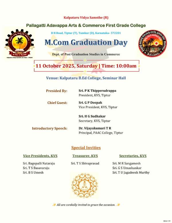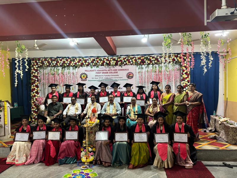 On 11-10-2025, a Graduation Day was organized for the second Year M.Com students at Pallagatti Adavappa Arts and Commerce First Grade College, Tiptur.